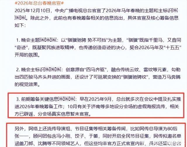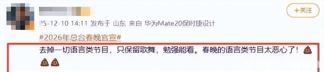 在阅读此文之前,辛苦您点击一下“关注”,既方便您进行讨论和分享,又能给您带来不一样的参与感,感谢您的支持!       爆款       编辑丨       招财       春晚伴陪伴每个人的大年三十,不得不说小时候的我们吃的是真好,不是赵本山就是陈佩斯,       “流量明星”的出现除了好看,其他的真是让人咂舌,背靠庞大粉丝却没有实力支撑,成为“笑话”已经不是一天两天的事了,       2026央视春晚主题官宣𱎳天,两大恶心情况发生了,原来陈佩斯没说错。       官宣春晚主题       眼看这一年又要结束了,忙忙碌碌的一年大家期待的无非就是春节假期以及大年三十一家人团聚吃饺子的画面,而春晚的节目则是这新年里的又一乐趣,       曾经一边吃着饺子一边看着赵本山等人的小品,嘴角那真是压都压不住,甚至因为实在太过搞笑第二天很多人会选择再看一次。       这不,新的一年即将到来,央视春晚的官方也官宣出马年的春晚主题,整个标识和主题都是围绕着“马”进行的,       不得不说这含义以及标识设计的确实很好,其实前几天春晚官方就发出了节目招募令,邀请更多有想法的朋友投稿,       招募令的意思很明显了,只要你的节目够有看点,被选中就可以踏上大舞台,这一消息发酵后,引发大家的热烈讨论,       有人推荐自己喜欢的网红,有人推荐自己喜欢的偶像上台,当然更多的人还是在呼吁能够再次在舞台上看到各个老艺术家们。       春晚参加的嘉宾人选和节目自然是大家都关心的问题,不过在央视春晚官宣仅仅一天后,两大恶心的情况发生了,原来陈佩斯没有说错。       两大恶心的情况       现在的春晚逐渐没了以前的感觉,老艺术家退场后并没有几个能够扛起起来的后辈,前些年的节目质量和如今的节目质量差距不是一丁半点,       就拿赵本山、范伟、陈佩斯等人来说,他们这些老艺术家创造了不知道多少名场面以及让人捧腹大笑的金句。       再看如今的作品,俨然成了带货现场,节目质量有时候尴尬到大家都看不下去,难怪会被网友建议“专业的人干专业的事”,       在央视春晚官宣以后,出现了两个恶心的情况,第一,评论区的网友们纷纷点出自己偶像的名字,清一色的都是“流量明星”,       那些长得帅气的“小鲜肉”名字赫然在列,说句实话这些“小鲜肉”确实长得帅,有些人在唱跳方面确实很出圈,       但是说白了这样的实力在娱乐圈一抓一大把,说到要上大舞台这点实力还差的远。       流量时代很多靠脸出圈的“流量明星”其实实力根本不够看,但就是因为热度高、粉丝多、流量大而有了很多资源,可是资源是有了但却没有足够匹配的实力,       很多在偶像剧中靠脸帅耍的“小鲜肉”在大场合上真是上不了一点台面,然而偏偏还喜欢跨界,       像很多老艺术家人家跨界归跨界但是实力摆在那,曾经的老一辈演员那真是十八般武艺样样精通,       如今的“流量明星”是哪一界都没钻研明白就靠流量和粉丝来跨界,然而却让自己成了一个“笑话”。       除此之外的第二大恶心情况还是那些为了流量和热度制造假新闻的人,在春晚官方还没正式官宣的时候,       网络上就出现了很多没有被证实的信息,又是春晚导演名单又是嘉宾名单,其实仔细看就知道是假的,       就拿名单里出现的赵本山来说,很多年前老赵就已经退出大舞台了,而原因也很简单,       春晚的压力不是一般的大,需要付出很多精力,而老赵明显已经没有那个精力了,       毕竟岁数在那,再一个之前合作的老搭档都纷纷退出,也没有什么能够担得起他戏的对手。       这两大恶心情况的出现也说明了一个问题,网络时代真真假假的消息太多,大家还是要仔细辨别啊!       这几年春晚受到不小的热议,直到这个时候才明白原来陈佩斯没有说错。       陈佩斯的话       要说春晚什么节目最受期待,那言语类的节目必定是第一了,曾经赵本山、陈佩斯等人的小品让大家笑了一年又一年,       然而到了如今却却有网友建议去掉语言类的节目,究竟为什么言语类的节目会被嫌弃成这个样子呢?       其实说白了还是因为现在的小品开始强硬煽情,要不然就是教育大家,甚至在很多大家都没理解的地方就有观众纷纷鼓掌大笑,       直到看到陈佩斯曾经说的话,才明白原来都是有原因的,一个好的作品是不需要有计划安排的,观众们自然的呼声才是最真实的,可惜如今的春晚已经变了味,       “流量明星”的出现让人眼前一黑又一黑,演员们去唱歌让人眼前一愣又一愣,属于赵本山那些老艺术家的时代还是过去了,我们也吃的越来越糙了。       不知道您对此有什么看法呢?欢迎在下方评论区留下你的想法,喜欢文章记得点赞关注我们下期再见。       [免责声明]文章的时间、过程、图片均来自于网络,文章旨在传播正能量,均无低俗等不良引导,请观众勿对号入座,并上升到人身攻击等方面。观众理性看待本事件,切勿留下主观臆断的恶意评论,互联网不是法外之地。本文如若真实性存在争议、事件版权或图片侵权问题,请及时联系作者,我们将予以删除。       信息来源:       百科:赵本山、陈佩斯个人资料       陈佩斯再登央视坐镇